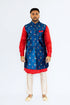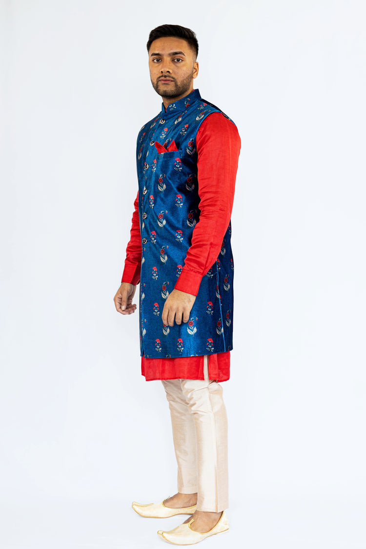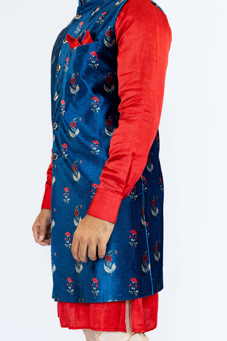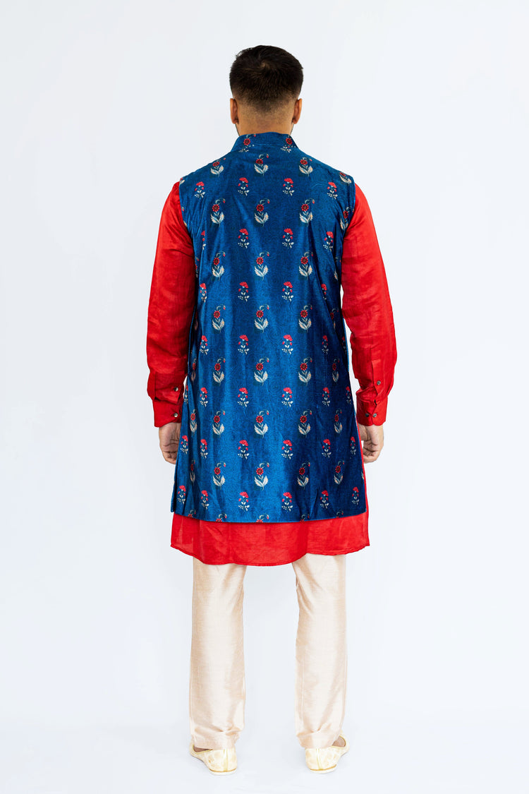 This thigh length vest made of 100% polyester gives a refreshing new look on traditional men's clothing. A blue velvet vest with a floral print that matches the red kurta, paired with a chic rose gold pyjama is sure to give you a sleek and upscale look.