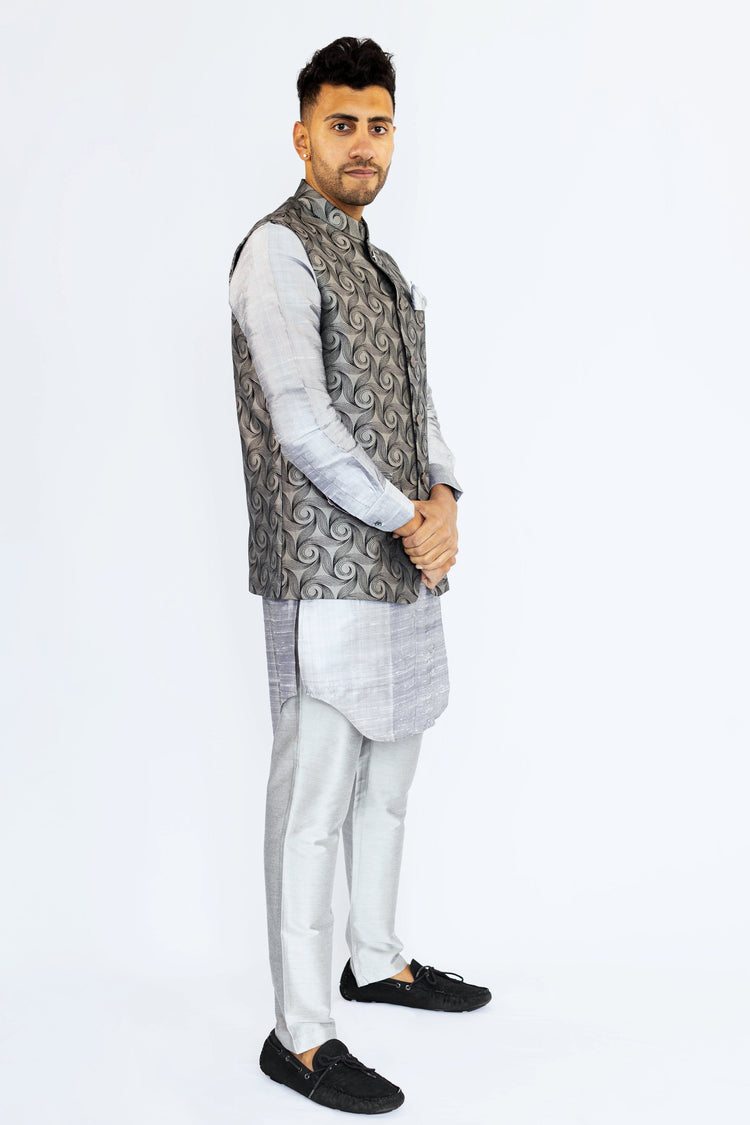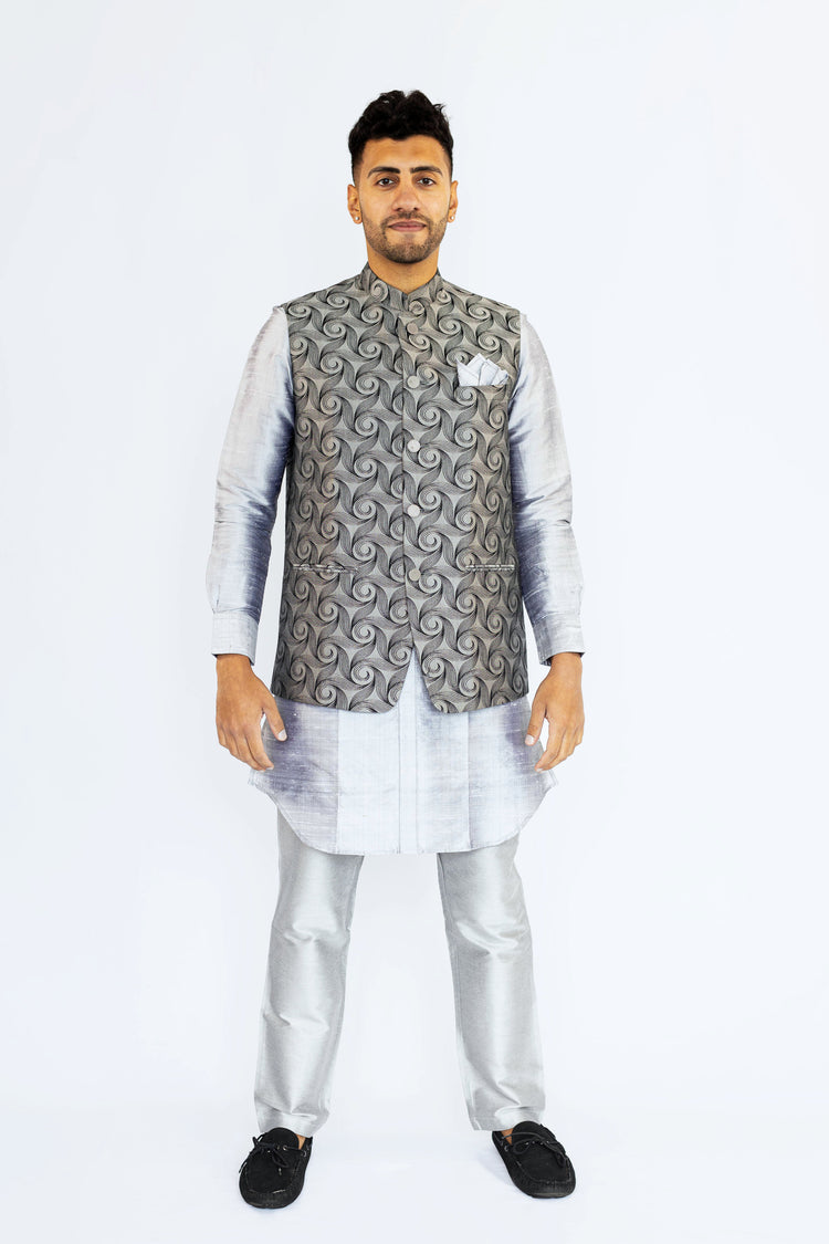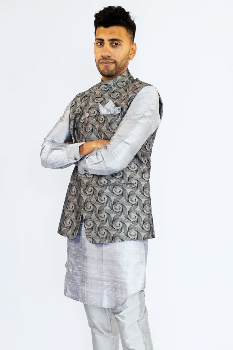 A black and grey geometric print vest revitalizes a classic silk and viscose blend kurta.
