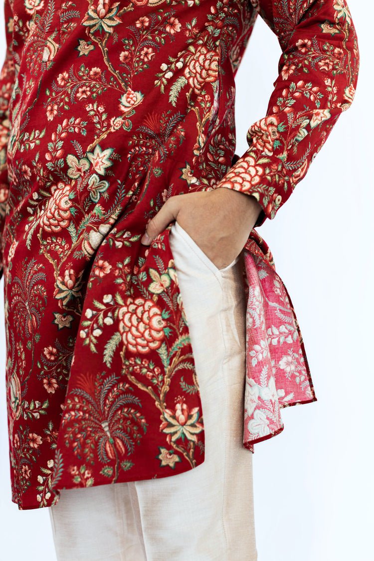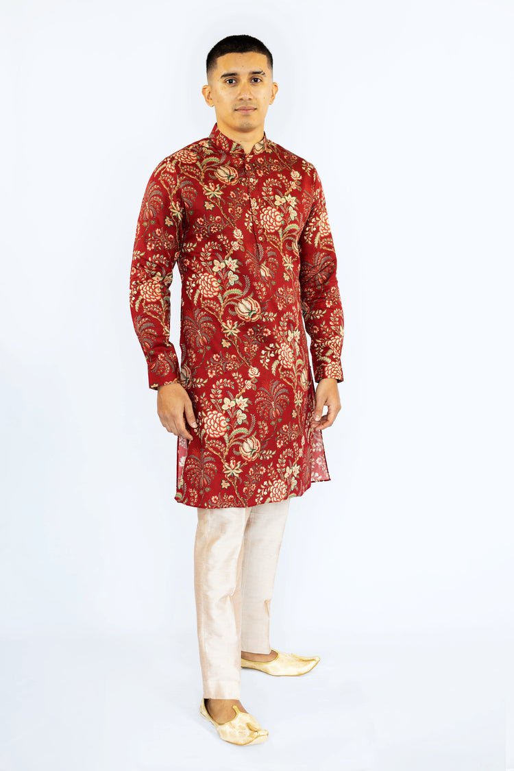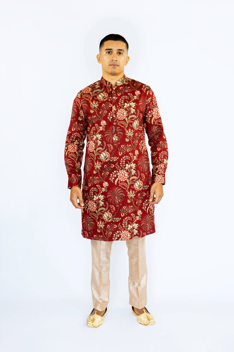 Upgrade your closet with this rustic styled kurta. Paired with a rose gold pant, this burgundy kurta is sure to turn some heads.