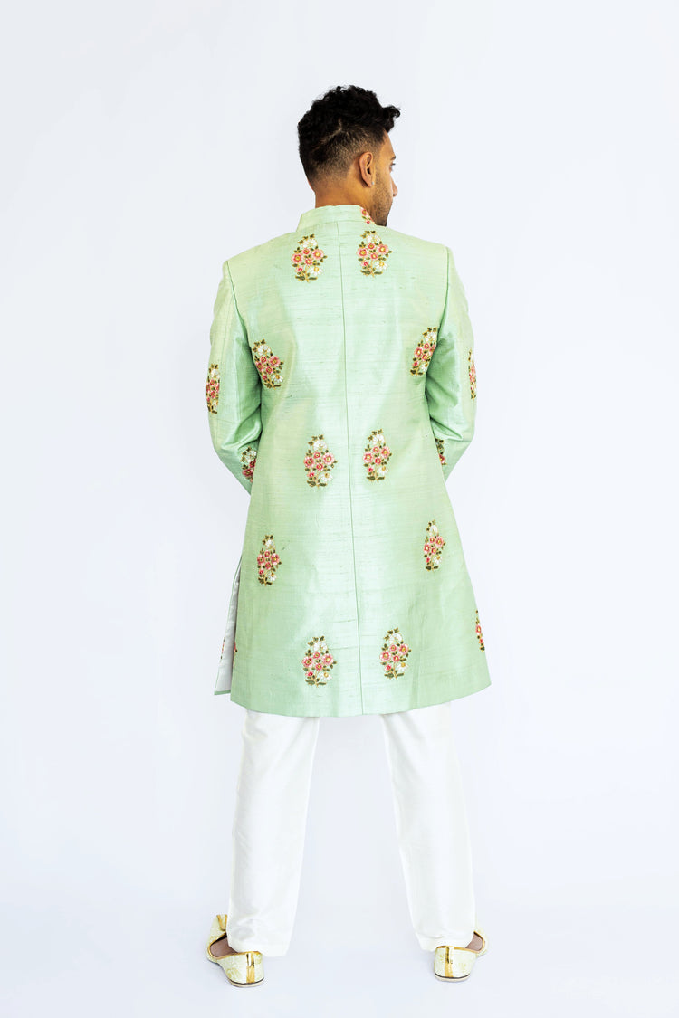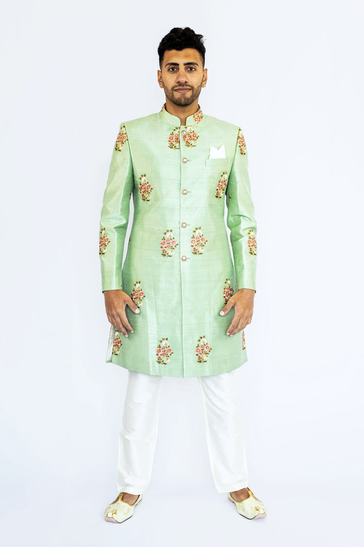 Luxurious and timeless, this pastel green achkan is composed of the finest silk. This vibrant set with its floral embroidering is sure to provide you with a classic Indian look.