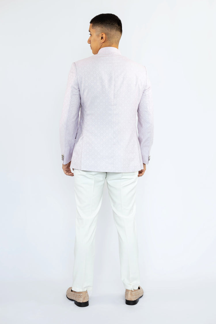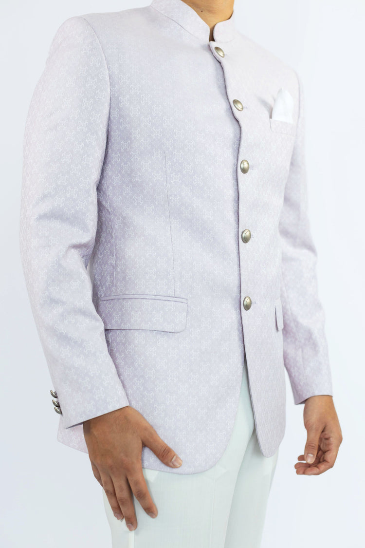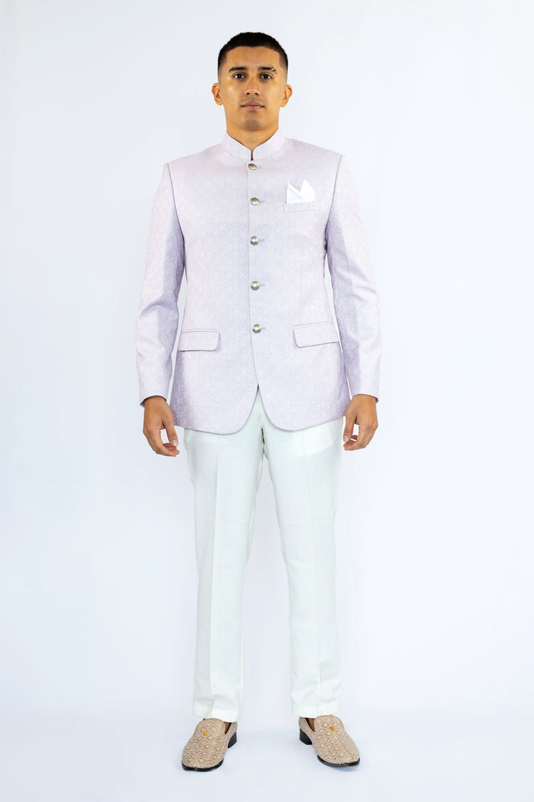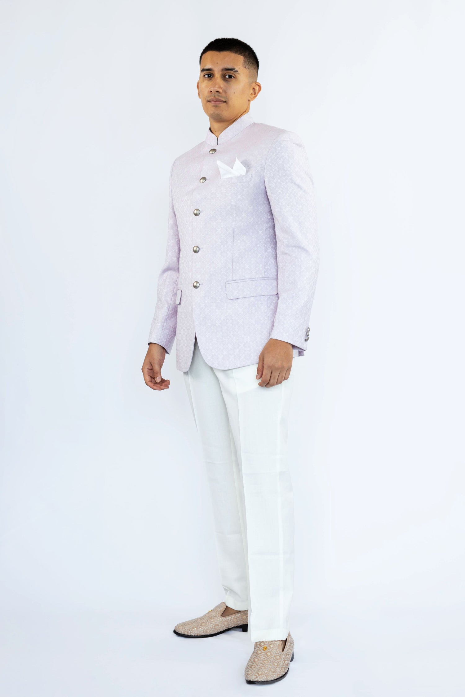 Designed with a beautiful polyester and wool blend, this lavendar and white embroidered bandhgala with a matching cream pant will be a great selection for any celebratory event.