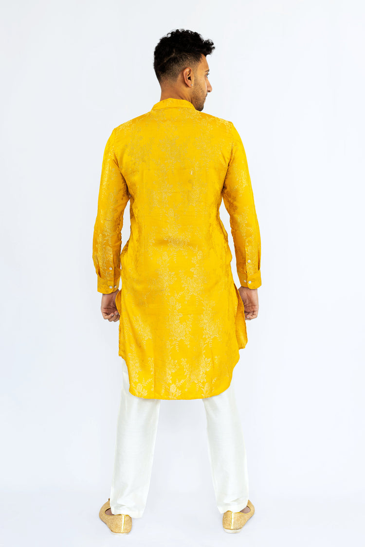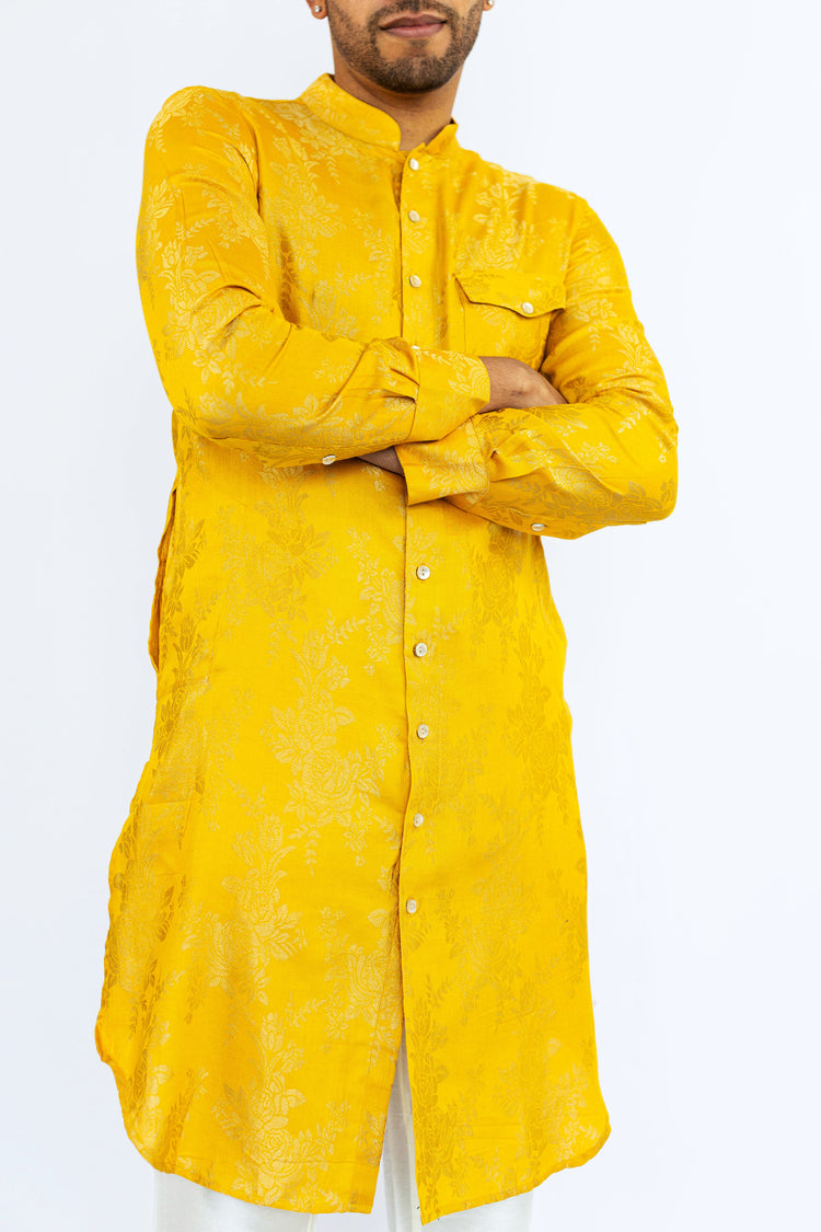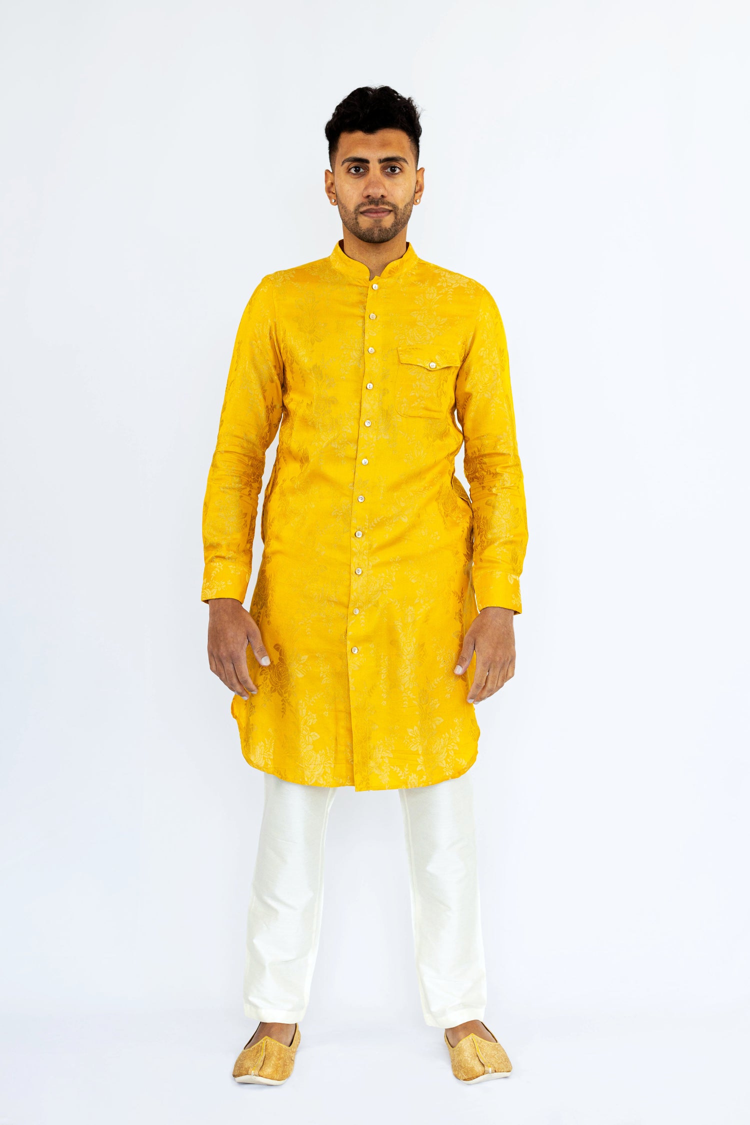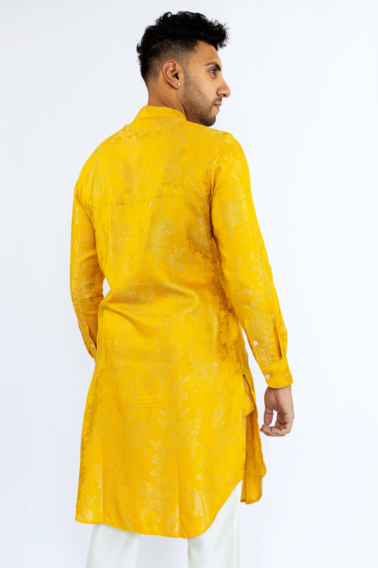 This yellow kurta with a gold floral print made of 100% cotton and with buttons running the entire length of it was designed specifically in mind of the wearer. No longer worry about getting stuck, this kurta is as easy as putting on a shirt.