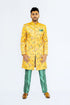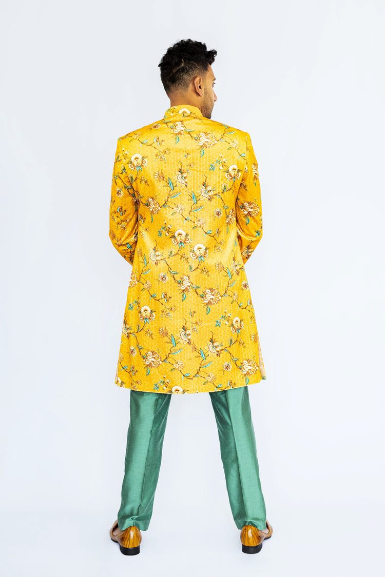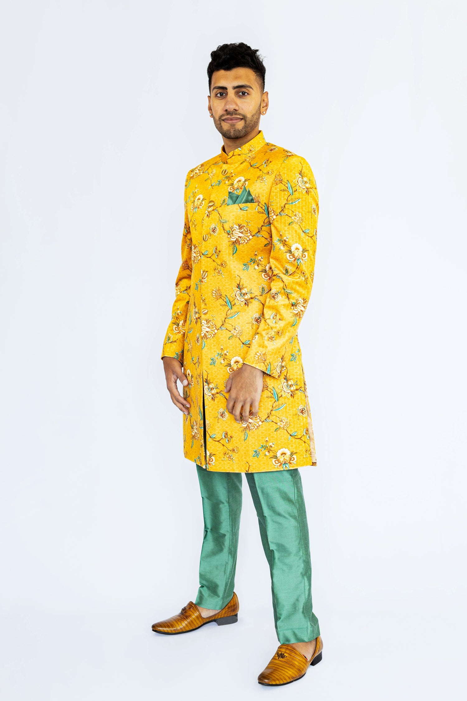 This handmade yellow velvet achkan with its floral and vine printed design will be a staple in your wedding wardrobe. Cut from a 100% polyester material, this outfit stands out for its exceptional softness and comfort.