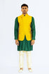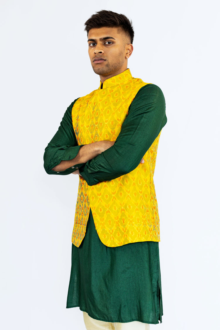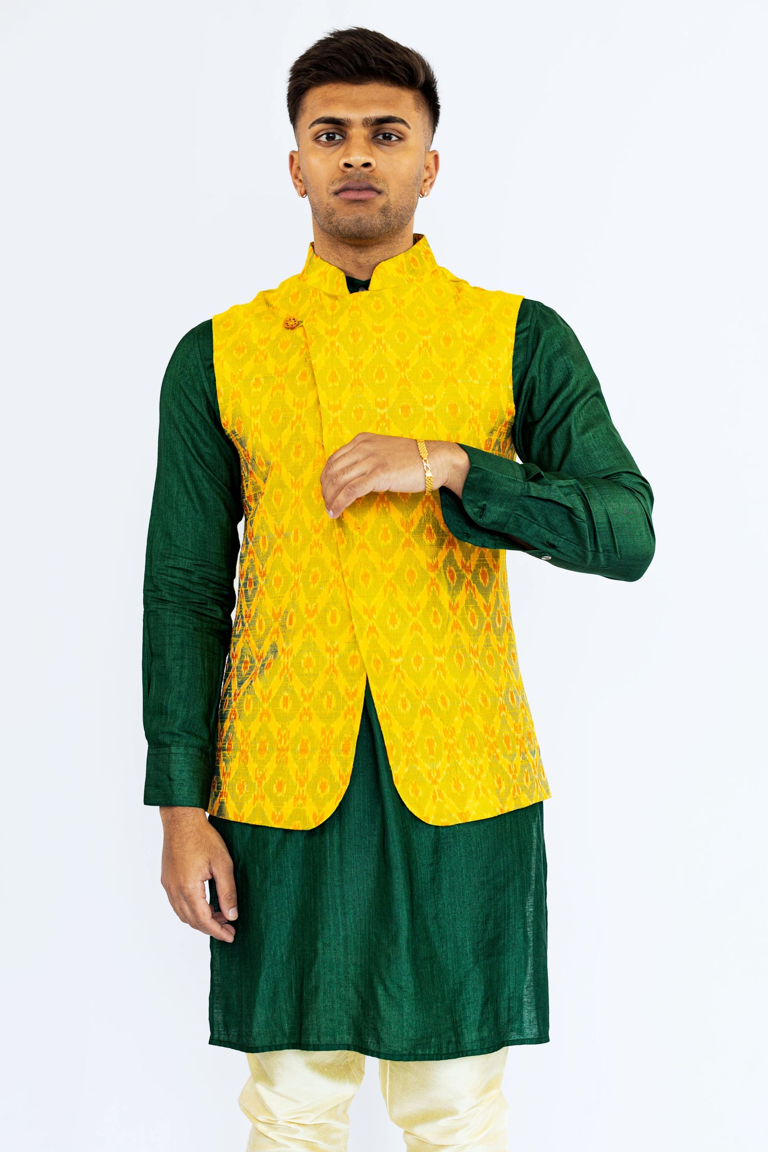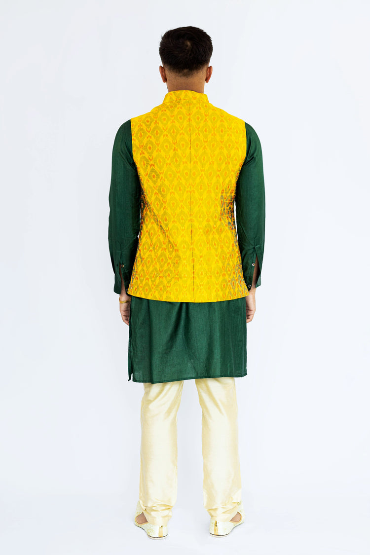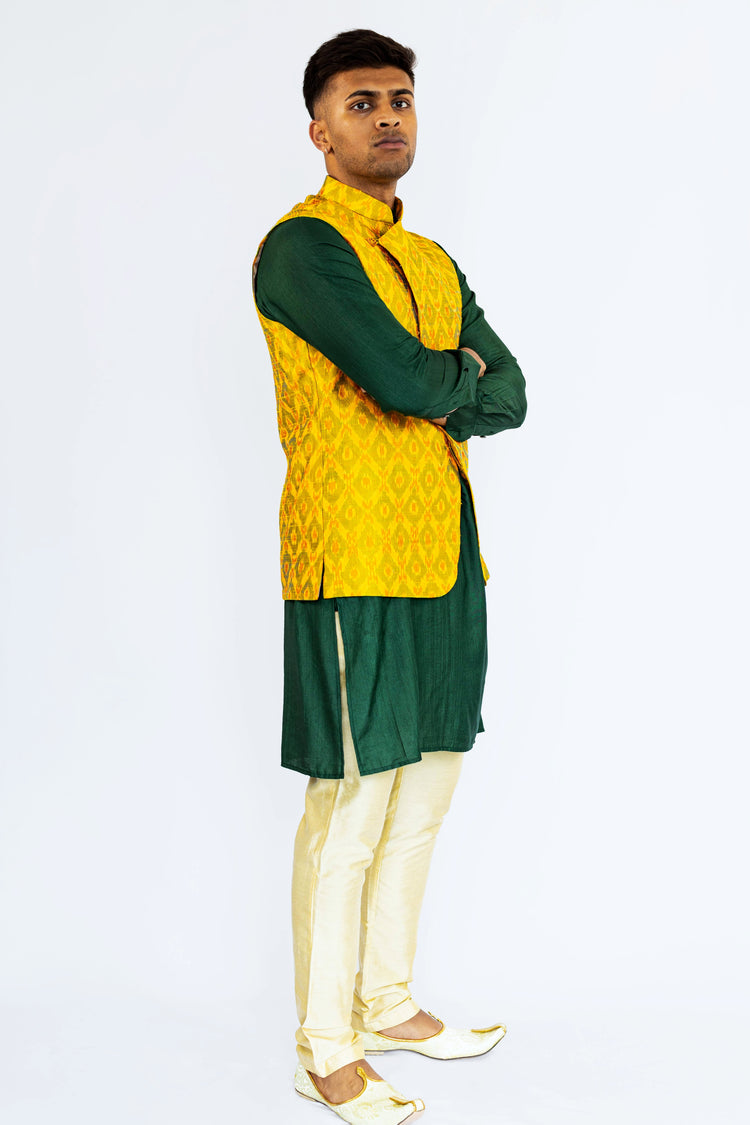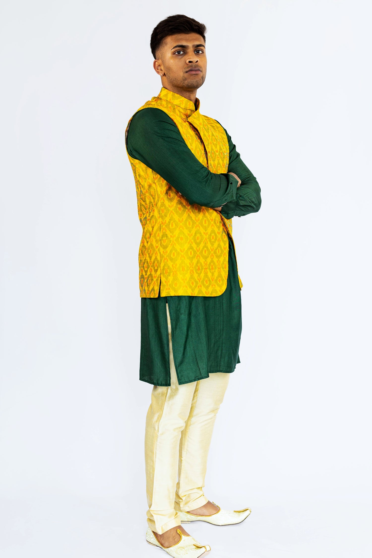 Made from 100% raw silk, this yellow uniquely embroidered vest is paired with a rich, deep green kurta making an everlasting impression.